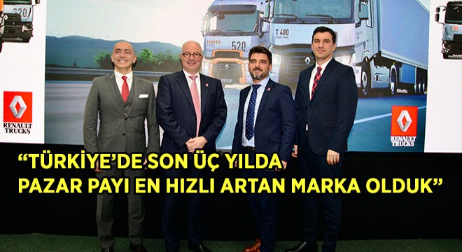 Renault Trucks Türkiye Başkanı Sebastien Delepine, "Türkiye'de 2017’de hedefimiz yüzde 10 pazar payına sahip olmak ve ilk 3 markadan birisi olmaktı. Son üç yılda pazarda en hızlı büyüyen marka Renault Trucks oldu. Bu üç sene sürecinde 16 ton pazarında, yüzde 3 pazar payından neredeyse yüzde 9 pazar payına ulaştık. 2019 yılında geçtiğimiz yıla oranla pazar, yüzde 36 daraldı ancak Renault Trucks olarak Türkiye pazarında en iyi lojistik çözümlerini sunarak ön plana çıkmayı başardık. T serimiz, pazarda en çok satılan ithal çekici oldu. 16 ton üzeri ticari araçlar pazarında payımız yüzde 9’a, çekici pazarında yüzde 16’ya yükseldi. 2019 senesi pazar payı anlamında Renault Trucks'ın bu bugüne kadar Türkiye’de geldiği en iyi nokta oldu" diye belirtti.