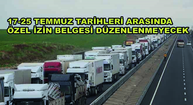 Kurban Bayramı tatili nedeniyle yollardaki taşıt trafiğinin artacağı öngörülmekte olup 17 Temmuz 2021 ile 25 Temmuz 2021 tarihleri arasında 9 (dokuz) gün süre ile gabari dışı, ağır taşıtlar için Özel İzin/Özel Yük Taşıma İzin Belgesi düzenlenmeyecektir."