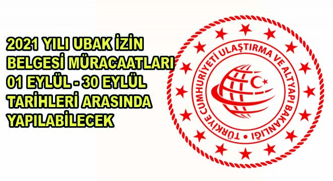 Bu kapsamda, 2021 yılı UBAK İzin Belgesi müracaatları ile ilgili işlemler firma yetkililerince e-devlet kapısı üzerinden Ulaştırma ve Altyapı Bakanlığı hizmetlerinden Sınır İşlemleri altında "UBAK İzin Belgesi Dağıtımı Başvurusu" seçeneği seçilerek 01 Eylül - 30 Eylül 2020 tarihleri arasında yapılabilecektir.