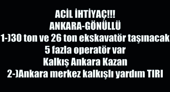 ANKARA-GÖNÜLLÜ 1-)30 ton ve 26 ton ekskavatör taşınacak 5 fazla operatör var Kalkış Ankara Kazan 2-)Ankara merkez kalkışlı yardım TIRI