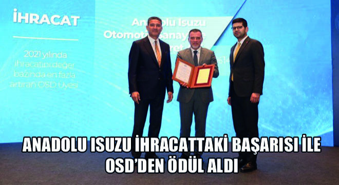 2021 yılında rekor ihracat rakamlarına imza atan Anadolu Isuzu, başarılarını yeni ödüllerle taçlandırmaya devam ediyor. Anadolu Isuzu son olarak Otomotiv Sanayii Derneği (OSD) tarafından OSD Başarı Ödülleri kapsamında “2021 yılında ihracatını değer bazında en fazla artıran OSD üyesi” olma başarısını göstererek ödüle layık görüldü. Anadolu Isuzu 2021 yılında ihracatta kaydettiği %148’lik artışla bu ödülün sahibi oldu.
