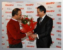 Anadolu Isuzu Satış ve Pazarlama Müdürü Fatih Tamay’dan sembolik araç anahtarını alan Galip Öztürk aracın direksiyonuna geçip gazetecilere poz verdi.