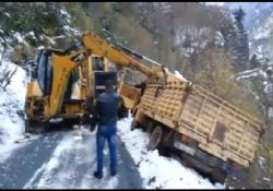 Artvin Merkeze bağlı Hatila Köy yolunda yoldan çıkan kamyonu kurtarma çalışması sırasında ilginç görüntüler yaşandı.