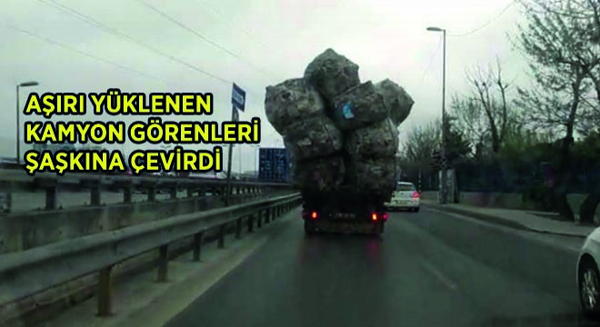 E-5 karayolunda Küçükçekmece’den Avcılar istikametine doğru yan yoldan giden kamyonun kasasına yüklenen çuvallar görenleri şaşkına çevirdi. Kamyonun kasasına yüklenen çuvalların yüksekliği neredeyse aracın iki katı boyutuna ulaştı. Trafikte seyreden kamyonetin sürücüsünün taşıdığı aşırı yüke aldırış etmeden çevredeki sürücülerin canını hiçe saydığı görüntü, cep telefonu kamerasına yansıdı. Daha fazla kazanmak uğruna geri dönüşüm malzemelerini taşırken trafik kurallarını hiçe sayan sürücü bu kadarına pes dedirtti.