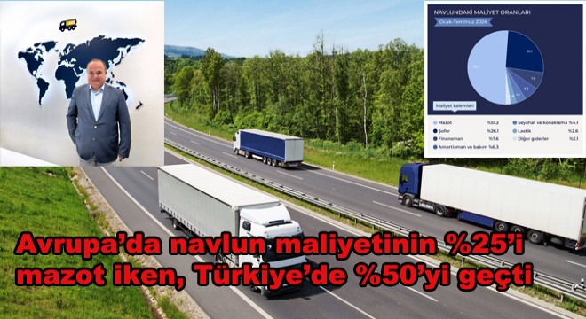 “Avrupa'da navlunun %25’i (1/4) mazot maliyetiyken, Türkiye'de %50’si (1/2) mazota gidiyor. Tabi burada başka bir parametre daha var. Avrupa'da mazot maliyeti hesaplanırken "gidiş" + "boş dönüş" olarak dikkate alınırken, Türkiye'de tek yön gidiş olarak dikkate alınır. Boş dönmek zorunda kalan kamyon, zarar eder. Örneğin, bir kamyon 400 km üzeri yol yaptığında, dönüş yükü organizasyonu yapamadan dönerse, zarar edebiliyor. Bu nedenle, birçok büyük firmanın nakliye satın almacıları bakkal hesabı ile “gidilecek kilometrede yakılacak mazot gideri X 2" formülü ile navlun hesaplamaya başladı. Navlunu oluşturan bilimsel maliyet merkezleri yok sayılıyor. Bu durum nakliye sektörünü, özellikle de bu sektörün bel kemiği durumunda olan bireysel kamyon sahiplerini çok zorluyor.” dedi.