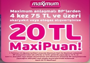 BP ve Maximum Kart işbirliği ile 1 Temmuz – 15 Ağustos tarihleri arasında kampanyaya katılan ve anlaşmalı BP istasyonlarından tek seferde ve farklı günlerde 75 TL ve üzeri 4 akaryakıt veya otogaz alışverişleri yapan Maximum Kart sahipleri 20 TL MaxiPuan kazanıyor.