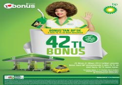 BP ve Bonus işbirliğinde başlayan yeni kampanyada, 25 Nisan – 31 Mayıs 2013 tarihleri arasında Bonus üyesi BP istasyonlarından farklı günlerde 5 kez ve tek seferde 75 TL ve üzeri akaryakıt veya otogaz alışverişi yapan müşterilerin Bonus kartına 42 TL değerinde akaryakıt ve otogaz alımlarında geçerli Bonus yüklenecek. Kazanılan bonuslar 7-17 Haziran 2013 tarihleri arasında kampanyaya katılan Bonus üyesi BP istasyonlarından yapılacak akaryakıt veya otogaz alımlarında geçerlidir.