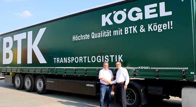 Photo, from left to right: Bernhard Reichert, Managing Director of BTK Befrachtungs- und Transportkontor GmbH and Thomas Conseil, Key Account Manager at Kögel in front of a Kögel Lightplus in the BTK design