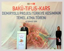 Konuşmaların ardından Gürcistan Cumhurbaşkanı Saakaşvili, Azerbaycan Cumhurbaşkanı Aliyev ve Cumhurbaşkanı Gül, platformdaki haritada kendi ülkelerinin üzerine demiryolu işaretlerini koyarak temel atma törenini gerçekleştirdi.