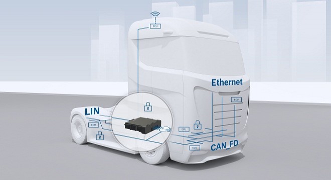 Merkezi ağ geçidi ünitesi: Merkezi ağ geçidi, kamyonlardaki ECU’lar (elektronik kontrol üniteleri) ve dış dünya arasındaki tüm veri alışverişini kontrol ediyor ve böylece, ağa bağlı ticari araçların merkezi iletişimini sağlıyor. Modern iletim ve şifreleme teknolojileri, veri alışverişini güvenli hale getiriyor. Aynı zamanda güvelik duvarları ve Bosch’un yan kuruluşları olan ETAS ve ESCRYPT tarafından geliştirilen izinsiz giriş tespit sistemleri kullanarak araç ağına yasa dışı erişim engelleniyor.