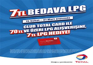 Club TOTAL Card sahipleri, 15 Şubat – 31 Mart 2016 tarihleri arasında anlaşmalı TOTAL istasyonlarından tek seferde yapacakları 70 TL ve üzeri LPG alımlarında 7 TL bedava LPG kazanacak.