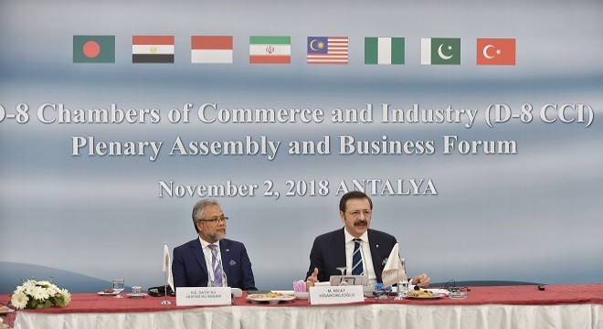 Hisarcıklıoğlu D-8 TSO Genel Kurulu’nun ardından yapılan D-8 TSO İş Forumu’nun açılışında yaptığı konuşmada, toplantının yapıldığı Antalya’nın Türkiye’de turizmin başkenti olduğunu ve bu yıl 14 milyon turist beklediklerini ifade etti. D-8’in geçmişine ilişkin bilgi veren Hisarcıklıoğlu kuruluşun 21 yıl önce Necmettin Erbakan’ın vizyonu ile oluşturulduğunu hatırlattı. D-8’in çatışma yerine barışı, karşı karşıya gelmek yerine diyalogu, adaleti, demokrasiyi ve eşitliği ilke edindiğini anlatan Hisarcıklıoğlu, “D-8 üye ülkeleri olarak benzersiz bir coğrafyaya sahibiz. Zengin doğal kaynaklarımız, genç ve dinamik bir nüfusumuz var. 1997’de D-8 kurulduğunda 14 milyar dolar olan ülkelerimiz arasındaki ticaret hacmi bugün, 100 milyar dolar civarında. Bu güzel ancak yeterli değil. Bir dönem bin 800 dolar civarında olan kişi başı gelirimiz, bugün 4 bin 500 dolarlara çıktı. Toplamda 3,7 trilyon dolarlık bir ekonomiye sahibiz.” dedi.