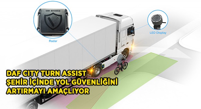 DAF City Turn Assist; yaya, bisiklet, otomobil ve motosiklet gibi diğer yol kullanıcıları sürücünün yan kör nokta alanında olduğunda sürücüyü görsel ve sesli uyarılarla ikaz etmek için tasarlanmış bir güvenlik özelliğidir. İzleme sistemi; şehir içi sürüş sırasında düşük hızlarda uyarı vermekle kalmaz, aynı zamanda yüksek hızlarda akan trafikte şerit değiştirirken veya şeride katılırken yan şeritteki diğer yol kullanıcılarını da algılıyor.