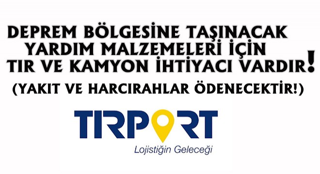 İstanbul, Ankara ve İzmir çıkışlı deprem bölgesine götürülecek çok sayıdaki yardım malzemeleri için tır ve kamyon ihtiyacı bulunduğunu duyuran TIRPORT'a, araç sahipleri 0850 847 76 78'den ulaşabilecektir.