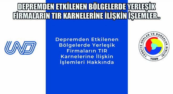 Bu kapsamda; merkez adresi afetten etkilenen illerde olan firmalar, süresi içinde iade edilemeyen TIR karnelerinden dolayı 6 ay süreyle AskTIRWeb sistemi üzerinden askıya alınmayacak, iade işlemine ilişkin takipler, belirtilen süre sonunda TOBB tarafından yürütülecektir.