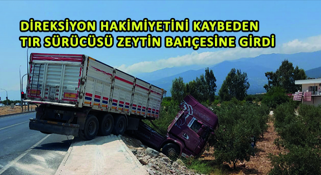 Alınan bilgiye göre, Hassa istikametinden Kırıkhan yönüne giden Ç.T. yönetimindeki 35 KG 3904 çekici plakalı tır, yolda seyir halinde iken Aktepe Gülkent Mahallesi mevkiinde direksiyon hakimiyetini kaybetti. Tır, yol kenarında bulunan zeytin bahçesine girmesinin ardından durdu.