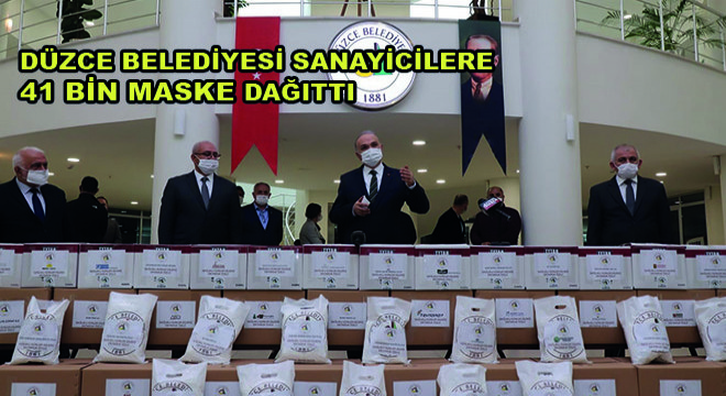 Dünya'da ve Türkiye’de etkili olan korona virüs salgını dolayısıyla kollarını sıvayan ve maske üretimi yapan Düzce Belediyesi, Düzce Ticaret ve Sanayi Odası ile yapılan işbirliği çerçevesinde sanayici oda üyelerine 41 bin maske dağıttı. Düzce Belediyesi Kültür Merkezi’nde yapılan maske dağıtımına Ticaret ve Sanayi Odası’na kayıtlı üretim yapan sanayiciler ile Düzce Belediye Başkanı Dr. Faruk Özlü, Düzce Ticaret ve Sanayi Odası Başkanı Tuncay Şahin katıldı. Yapılan maske dağıtımında 41 bin maske sanayicilere dağıtılırken 61 bin maske dağıtımı daha yapılacak.
