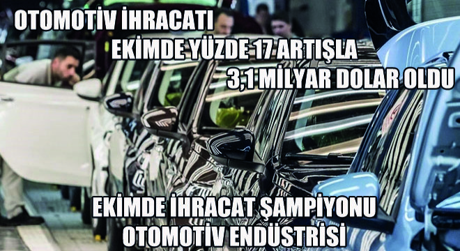Uludağ Otomotiv Endüstrisi İhracatçıları Birliği (OİB) verilerine göre, Türkiye otomotiv endüstrisinin ekim ayı ihracatı geçen senenin aynı dönemine göre yüzde 16,6 artış ile 3 milyar 87 milyon dolar oldu. Endüstrinin toplam ihracattaki payı ise yüzde 13,5 oldu.
