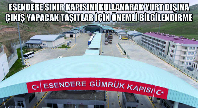 TOBB tarafından yapılan bilgilendirmeye istinaden, Esendere sınır kapısını kullanarak yurt dışına çıkış yapacak taşıtların ihtiyaç duyduğu geçiş belgelerinin tahsisi ile ilgili olarak Yüksekova Ticaret ve Sanayi Odası yetkilendirilmiştir.