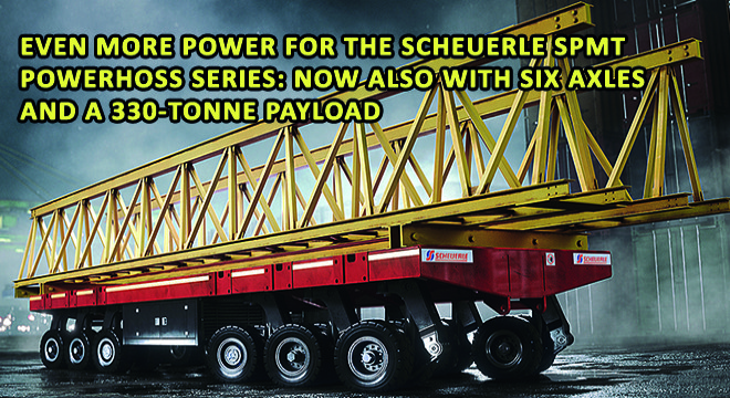 Up to now, SCHEUERLE, a subsidiary of the Transporter Industry International Group (TII Group) owned by the Rettenmaier entrepreneurial family from Heilbronn, has always offered SPMT PowerHoss modules with two and four axles; however, a version with six axles now complements the series. While the two and four-axle versions offer payloads of up to 85 and 174.9 tonnes per module respectively, the six-axle vehicle accommodates up to 330 tonnes of payload. In addition, individual SCHEUERLE SPMT PowerHoss modules can be operated in an uncomplicated manner according to the plug-and-play principle either mechanically or electronically in a loose coupling mode as well as being coupled to one another both laterally or longitudinally in order to meet even higher payload requirements. Thus, a vehicle combination of four SPMT PowerHoss 330s is able to move loads with a unit weight of up to 1,320 tonnes.
