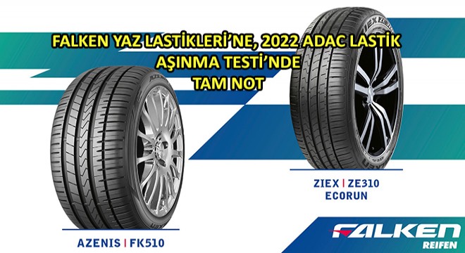 Falken AZENIS FK510 premium lastikleri ADAC aşınma testinde 15 lastik üreticisine ait 3 yaz ve 3 kış lastiği 2022 parçacık aşınma incelemesinde en yüksek notları aldı. Falken AZENIS FK510 225/40 R18 ebatı, kategorisinde birinci olurken, ZIEX ZE310 Ecorun 185/65 R15 kategorisinde üçüncü olarak Falken’in genel sıralamada dördüncü olmasını sağladı.