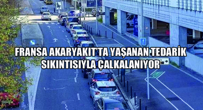 Fransa'da benzin istasyonlarının yaklaşık yüzde 30 kadarında akaryakıt tedarik sıkıntısı yaşanması nedeniyle Goussainville'de birçok mağazanın bulunduğu bir alanda yer alan benzin istasyonunun önünde uzun kuyruklar oluştu.