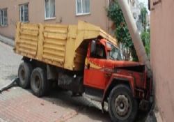 Olay anında korku dolu anlar yaşatan kamyon, cadde üzerinde bir markete girmek üzereyken elektrik direğine çarparak durdu.Kazada, markette maddi hasar oluştu.