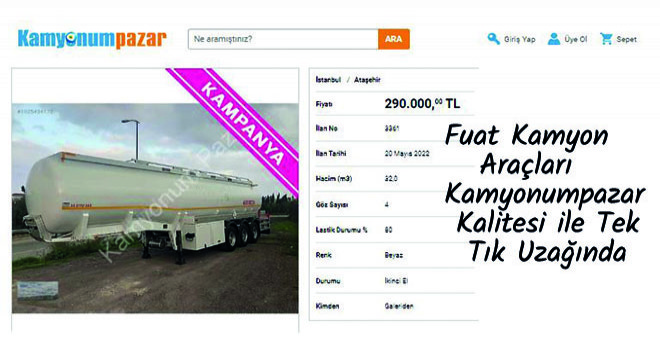 Kamyondan çekiciye, dorseden römorka yüzlerce marka ve araç seçeneği kamyonumpazar'da. Fuat Kamyon ilanları için tıkla! www.kamyonumpazar.com alışverişe başla!!