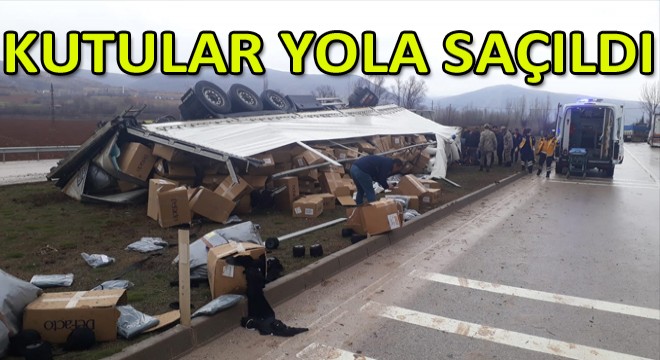 Edinilen bilgiye göre Tokat istikametine seyir halinde olan tır, yağmur yağışı sonucu kayganlaşan yolda yan yatarak sürüklendi. Kazadan yaralı olarak kurtulan şoför aracın ön camından çıkarıldı. Ambulansla Tokat Devlet Hastanesi Acil Servisine kaldırılan şoförün genel sağlık durumunun iyi olduğu öğrenildi. Yan yatan tırın dorsesinde kavşağa kolilerle saçılan giysiler ise görevliler tarafından toplandı.