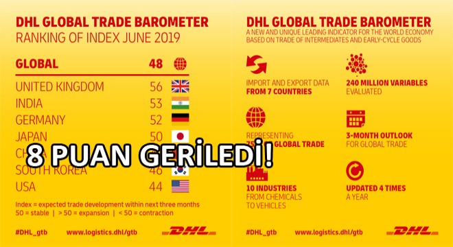 DHL Global Ticaret Barometresi (GTB), yayınlanmaya başlandığı Ocak 2018’den bu yana ilk kez, önümüzdeki üç ayda dünya ticaretinde ufak çaplı bir daralma yaşanacağına işaret ediyor. Dünya ticaretinin görünümünü ortaya koyan endeks toplam 8 puanlık bir düşüşle 48’e geriledi. Ara ve ham ürünler alanındaki ticaret akışı üzerinden yapılan değerlendirmeler belirlenen endeks değerindeki bu yeni seviye, dünya ticaretinin, önümüzdeki üç ayda az da olsa gerilemesinin beklendiği anlamına geliyor. Bu düşüşte GTB’nin iki temel bileşeni olan hava ve konteynerize deniz ticaretindeki kayda değer azalma etkili oldu. Hava ticaretinin endeks değeri 6 puan gerileyerek 49’a, konteynerize deniz ticaretinin endeks değeri ise 8 puan gerileyerek 48’e düştü.