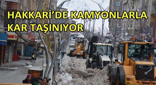 Hakkari çarşı merkezinde biriken kar yığını, belediye ekipleri tarafından kamyonlarla kent dışına taşınıyor.
