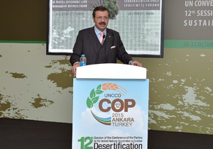 TOBB Başkanı M. Rifat Hisarcıklıoğlu, Birleşmiş Milletler Çölleşme ile Mücadele Sözleşmesi (UNCCD) 12. Taraflar Konferansı (COP12) Sürdürülebilir Arazi Yönetimi İş Forumu kapsamında Ankara İş Dünyası Deklarasyonu sunumunu gerçekleştirdi ve basın toplantısına katıldı. Basın toplantısında Dünya Sürdürülebilir Kalkınma İş Konseyi (WBCD) Temsilcisi Violaine Berger ve April Grup CEO’su Bey Soo Khiang da yer aldı.