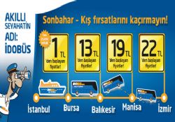 Yine İDOBÜS’le İstanbul-Balıkesir Hattı için karşılıklı 13 TL’den, İstanbul-Manisa Hattı için karşılıklı 19 TL’den, İstanbul-İzmir Hattı için ise yine karşılıklı 22 TL’den başlayan fiyatlar bu hatlarda seyahat planlayan yolculara avantajlı seçenekler sunuyor. İDOBÜS, Balıkesir, Manisa ve İzmir için geçerli olan bu 13, 19 ve 22 TL’lik fiyatlar için toplam 26 bin koltuk kontenjanı ayırmış durumda.