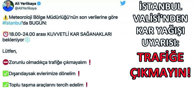 Sosyal medyadan açıklama yapan Vali Yerlikaya, '18.00-24.00 arası kuvvetli kar sağanakları bekleniyor. Zorunlu olmadıkça trafiğe çıkmayalım. Dışarıdaysak evlerimize dönelim. Toplu taşıma araçlarını tercih edelim' paylaşımı yaptı.