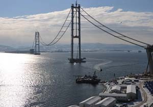 İstanbul ile İzmir arasındaki ulaşım süresini 9 saatten 3,5 saate indirecek Gebze-Orhangazi-İzmir Otoyolu Projesi'nin en büyük ayağını oluşturan köprüdeki çalışmalar devam ediyor.