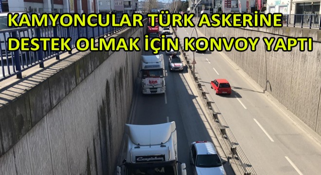 Türk Silahlı Kuvvetlerinin başlatmış olduğu ‘Bahar Kalkanı Harekatı'na ülke genelinden destek gelmeye devam ediyor. Son olarak Doğu Marmara Kamyoncular Motorlu Taşıtlar Kooperatifi Üst Birliği üyeleri, Türk askerine destek konvoyu gerçekleştirdi. Sakarya Ticaret ve Sanayi Odası (SATSO) önünde 50 kamyonun katılımıyla gerçekleşen konvoy öncesi Doğu Marmara Kamyoncular Motorlu Taşıtlar Kooperatifi Üst Birliği Bölge Birlik Başkanı Ali Dayıoğlu bir açıklama yaptı.