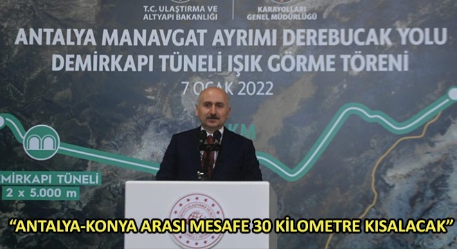 Ulaştırma ve Altyapı Bakanı Adil Karaismailoğlu, Antalya Demirkapı Tüneli Işık Görme Töreni'nde konuştu. “Yapım çalışmaları devam eden Antalya-Manavgat ayrımı Taşağıl-İbradi ayrımı yolumuz üzerindeki Demirkapı Tüneli’nde kazı çalışmalarını tamamladık” diyen Karaismailoğlu, çalışmalarının nihai amacının, üstün bir hizmet anlayışıyla, ticareti, turizmi daha da güçlendirmek olduğunu belirtti.