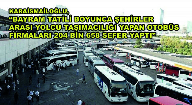 Karaismailoğlu, “Bayram tatili boyunca şehirler arası yolcu taşımacılığı yapan otobüs firmaları 204 bin 658 sefer yaparak; toplam 3 milyon 115 bin yolcu taşıdı. İstanbul'dan 354 bin 283, Ankara'dan 175 bin 909, İzmir’den 152 bin 694 yolcu başka yere seyahat etmek için otobüse bindi. İstanbul'a 325 bin 567, Ankara'ya 174 bin 150, İzmir’e 142 bin 611 yolcu geldi” dedi.