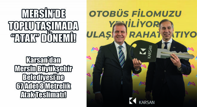 Ülkemizin önde gelen ticari araç üreticilerinden Karsan, ürün yelpazesiyle şehirlerin ulaşım altyapısını yenilemeye devam ediyor. Karsan, Türkiye’de yerel yönetimler özelindeki en yeni teslimatını da Tarsus Cumhuriyet Meydanı’nda düzenlenen törenle gerçekleştirdi. Anahtar teslim törenine Mersin Büyükşehir Belediye Başkanı Vahap Seçer, Mersin Milletvekili Ali Mahir Başarır, Tarsus Belediye Başkanı Haluk Bozdoğan, Mersin Büyükşehir Belediyesi Genel Sekreteri Olcay Tok, Mersin Büyükşehir Belediyesi Ulaşım Dairesi Başkanı Ersan Topçuğlu, Mersin Büyükşehir Belediyesi Toplu Taşıma Müdürü Bayram Demir ve Tarsus Belediyesi Meclis Üyeleri ile birlikte Karsan İç Satış ve Dış İlişkiler Genel Müdür Yardımcısı Muzaffer Arpacıoğlu ve Karsan Satış Müdürü Adem Ali Metin katıldı. Törene ayrıca sivil toplum kuruluşları ve meslek odalarının temsilcileri, muhtarlar ve çok sayıda vatandaş eşlik etti. Türkiye’nin yerli üreticisi, bu törenle birlikte Mersin Büyükşehir Belediyesi’ne 67 adet 8 metrelik Karsan Atak otobüsü teslim etmiş oldu.