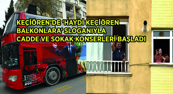 Keçiören Belediyesi, koronavirüsle mücadele çalışmaları kapsamında evlerinde kalan vatandaşların keyifli vakit geçirmesi için hareket halindeki üstü açık otobüsle cadde ve sokak konseri düzenledi. Her gün farklı bir sanatçının üstü açık otobüste 14.00-18.00 saatleri arası sahne alacağı konserlerin ilki Dilek Hürmeydan Basçı’nın seslendirdiği ezgilerle Keçiörenlilere keyifli bir gün yaşattı. Türk Halk Müziği ile birlikte hareketli eserlerin seslendirildiği konsere vatandaşlar evlerinin pencere ve balkonlarından eşlik ederek ilgiyle izledi. Her gün farklı sanatçıların sahne alacağı konserde aynı zamanda ‘Evde Kal’ çağrısı da yapıldı.