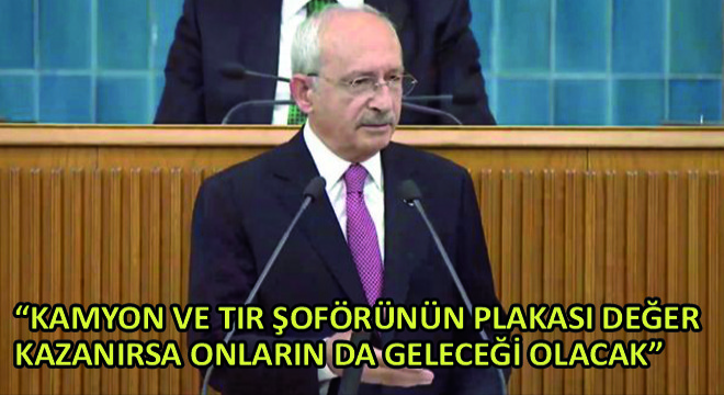 Kılıçdaroğlu, 20 yaşını doldurmuş kamyon, tır ve otobüslere hurda desteği vereceklerini, K1 belgelerinin satışına ve devrine izin vereceklerini, kamyon, tır ve şehirler arası otobüslerde plaka tahdidi getireceklerini öne sürerek, "Taksinin plaka tahdidi var mı? Var. Otobüslerin var mı? Var. Her plaka bunların bir gelecek güvencesidir. Plaka değer kazandıkça gelecek güvencesi oluyor. Kamyon ve tır şoförünün de plakası değer kazanırsa onların da geleceği olacak." değerlendirmesini yaptı.