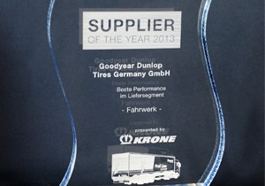 “Yılın Tedarikçisi” ödülü kapsamında, Bernard Krone GmbH firmasının 200 civarındaki ana tedarikçisi değerlendirildi. Yarışmanın jürisi; tedarikçi firmaların kalite ve lojistik performanslarının yanı sıra, maliyet değer karşılığını ve sunulan hizmetin performansını baz alınarak değerlendirmesini gerçekleştirdi ve Goodyear’ı “Yılın Tedarikçisi” seçti.