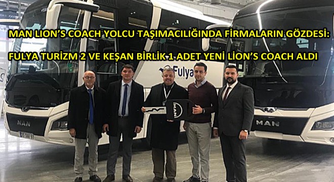İlk teslimat, İzmir taşımacılık sektörünün önemli firmalarından Fulya Turizm’e yapıldı. Yurt içi ve yurt dışı turizm taşımacılığı yapan Fulya Turizm, ocak ayında Ankara’da düzenlenen törenle, filosuna 2 adet 2020 model, 12 metre 2+2 koltuk düzenli Lions Coach kattı. Törene MAN Otobüs Satış Bölge Yöneticisi Emrah Albustanoğlu ile Fulya Turizm’in sahipleri Mustafa Kocaer, Hüseyin Kocaer ve Efe Kocaer katıldı.