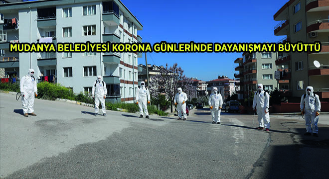 Temizlik ve dezenfekte çalışmalarını ilçenin tamamında uygulayan Mudanya Belediyesi, dayanışmayı da artırdı. Zabıta Müdürlüğü, Temizlik İşleri Müdürlüğü, Veteriner İşleri Müdürlüğü, Ulaşım Hizmetleri Müdürlüğü ve Zeytin Dalı ile Uğur Böceği sosyal hizmet birimlerinde Mudanya Arama Kurtarma (MAK) biriminde çalışan personelin tamamı görev yaparken, faaliyetleri iptal edilen Kültür Müdürlüğü personeli, ekiplere yardım için görevlendirildi. 5 bin 800 kişiye aylık gıda ve temizlik paketi, 65 yaş üstü ve kronik rahatsızlığı bulunan 2 bin 100 kişiye ise destek verildi.Hafta sonu İçişleri Bakanlığı tarafından uygulanan sokağa çıkma yasağı boyunca Mudanyalılara 75 bin ekmek dağıtımı yapıldı. Belediye ekipleri, koordinasyon içerisinde sürdürdüğü çalışmalar kapsamında halk sağlığını korumak amacıyla cadde ve sokakları, parkları, meydanları, hizmet binalarını, aile sağlığı merkezlerini toplu yaşama alanlarını özel hazırlanmış solüsyonlar ile dezenfekte ediyor.