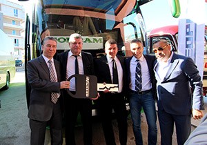 Yeni Tourliner’ın üstün niteliklerine paralel; müzik, teknoloji, tasarım ve koreografinin birleşerek, çarpıcı bir görsel ve işitsel şölen olarak sahnelendiği lansmanın henüz ilk saniyelerinde sektör temsilcilerinde oluşan büyük beğeni ve hayranlık, dakikalar içinde talebe dönüştü. Türkiye Lansmanı’nda sergilenen; özel tasarım ve renklerle üretilen 2+1 VIP oturma düzenli 3 adet NEOPLAN Yeni Tourliner, Türkiye seyahat sektörünün Tokat merkezli köklü firması TOPÇAM’a satıldı. Lansman otobüsleri olan özel metalik boyalı gold/sarı, yeşil ve lacivert renkli ilk üretim Yeni Tourliner’lar 4 Nisan Salı günü düzenlenen özel bir törenle TOPÇAM’a teslim edildi. Tokat Otogarı’nda düzenlenen teslimat töreni TOPÇAM Turizm’den firma sahipleri Erkut Dizman ve Olgun Dizman ile firma yetkililerinin evsahipliğinde gerçekleşti. MAN Kamyon ve Otobüs Ticaret A.Ş. adına Genel Müdür Tuncay Bekiroğlu, Otobüs Satış Direktörü Can Cansu ve Otobüs Bölge Koordinatörü Ufuk Demirer’in katıldığı törende, MAPAR Yönetim Kurulu Başkanı Yalçın Şahin ve diğer firma yetkilileri de hazır bulundular. Törenin ardından NEOPLAN Yeni Tourliner’lar kent turuna çıkarak Tokatlılara tanıtıldı. Gerçekleştirilen 3 adet Yeni Tourliner teslimatı ile birlikte 25 otobüse çıkan TOPÇAM Turizm’in özmal filosunun tamamı MAN ve NEOPLAN araçlardan oluşuyor.