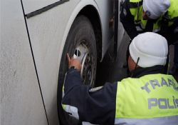Paşaköy mevkisinde yolcu otobüslerini durdurarak kontrol eden polis ekipleri, araç lastiklerini detaylı olarak inceleyerek, kış lastiği bulunmayan otobüslerin geçişine izin vermeyip sürücülerine para cezası kesiyor.