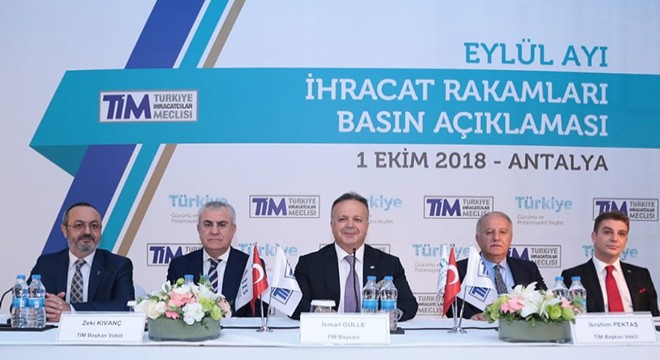 Türkiye İhracatçılar Meclisi (TİM) eylül ayı ihracat verilerini Antalya'da düzenlenen basın toplantısıyla açıkladı. Buna göre; eylülde ihracat geçen yılın aynı dönemine göre yüzde 22,5 artışla 14,5 milyar dolara yükseldi. Bu rakam bugüne kadar en yüksek ihracat gerçekleştirilen eylül ayı olarak kayıtlara geçti. Eylül ayında ayrıca ihracatta son 13 ayın en hızlı artışı yaşandı. Açıklanan verilere göre ilk 9 ayda ihracat yüzde 7 artışla 123 milyar 110 milyon dolar oldu.
