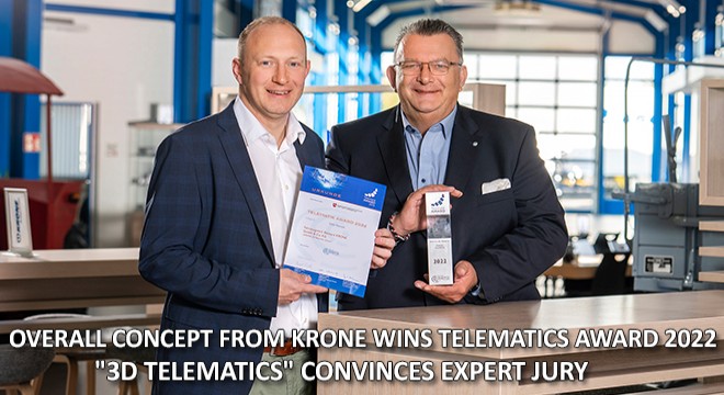 This coveted industry award is presented by the media group Telematik-Markt.de, which uses it to honor outstanding development achievements and solutions in the field of telematics. In the competition, Krone impressed with its "telematics of the third dimension" concept, which is particularly characterized by the use of new sensors and the application of artificial intelligence ("AI").