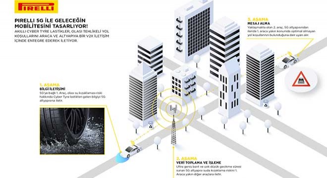 Araç ile yol arasındaki tek bağlantı noktası olan lastikler, Pirelli'nin mükemmelleştirdiği teknoloji sayesinde araç ve şoförle, 5G potansiyeli sayesinde de tüm yol altyapısıyla iletişim kurmayı başardı. İçinde bir sensör bulunan Pirelli Cyber Tyre, gelecekte lastik modeli, kat edilen kilometre, dinamik yük ve bir ilk olarak su birikintilerinden zayıf kavramaya kadar yol yüzeyindeki olası tehlike durumları gibi verileri otomobile iletecek. Bu bilgiler otomobilin kontrol ve sürüş destek sistemlerini adapte etmesini, güvenlik, konfor ve performans seviyesini ciddi ölçüde geliştirmesini sağlayacak. Aynı bilgiler, diğer otomobillere ve altyapıya da iletilecek. Pirelli, 5G'nin potansiyeli sayesinde lastiği karayolu ulaşım ekosisteminin tamamını kapsayan daha geniş bir iletişim bağlamında konumlandırabilecek ve geleceğin mobilite ve otonom sürüş sistemleri için çözüm ve hizmetlerin geliştirilmesine aktif olarak katkıda bulunabilecek.
