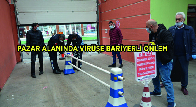 Koronavirüs (Covid-19) tedbirleri kapsamında pazarın bir gün öncesinden sabunlu suyla yıkanan halk pazarına, sosyal mesafenin korunması amacıyla da bariyerler yerleştirildi.